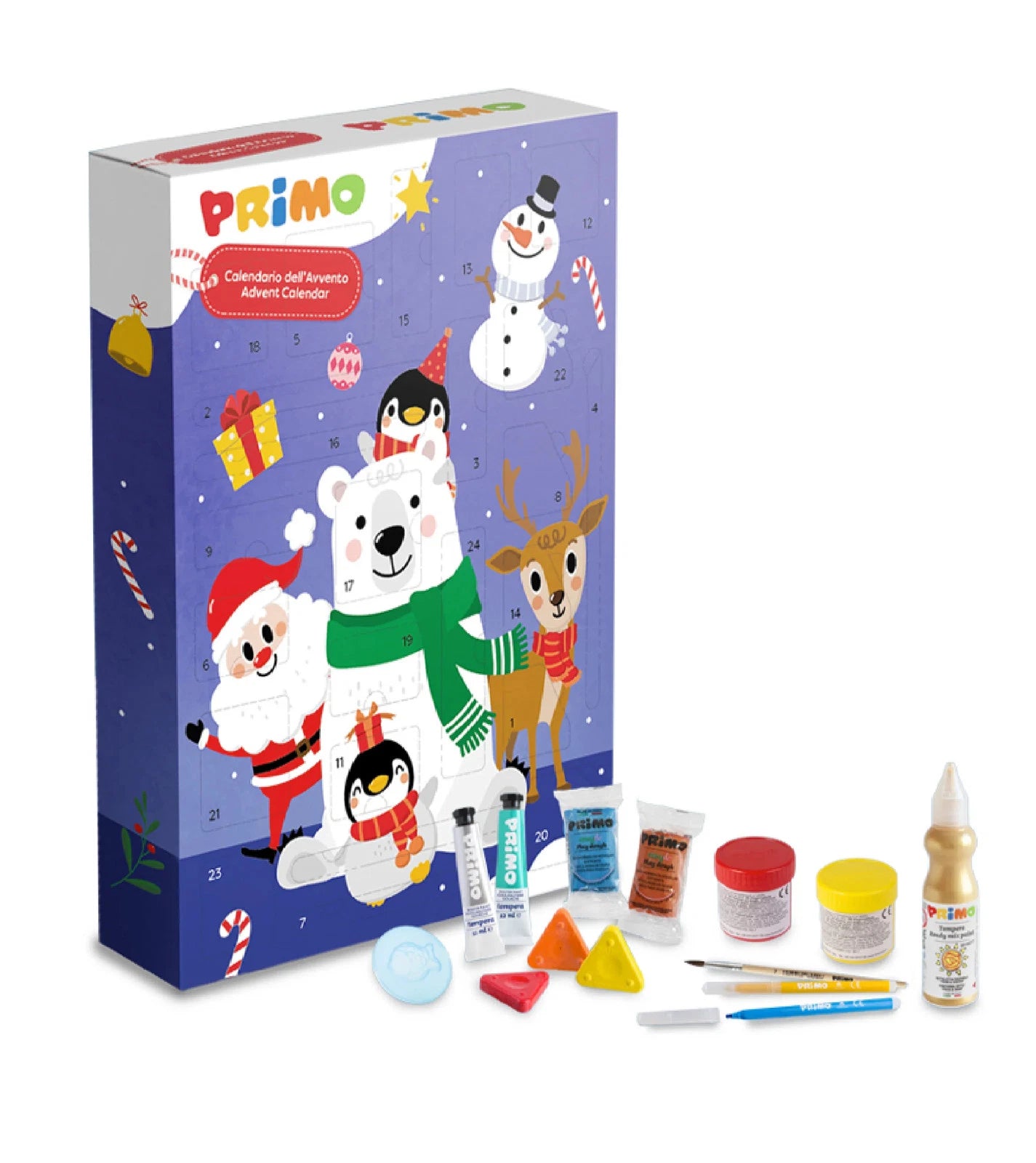 Scopri ogni giorno un'emozionante sorpresa con questo favoloso calendario dell'avvento per i bambini! Questo coloratissimo calendario dell'avvento, include: tempere, ditacolor, tempera fine, triangoli di cera, pennarelli, easydò, accessori per modellare, pennello. Un'attesa tutta da dipingere a creare. Inventa, modella e colora con le sorprese del calendario dell'avvento Primo. E non finisce qui, scansiona il QR Code e stampa le schede creative: puoi colorare, modellare e divertirti con tante attività creative!
