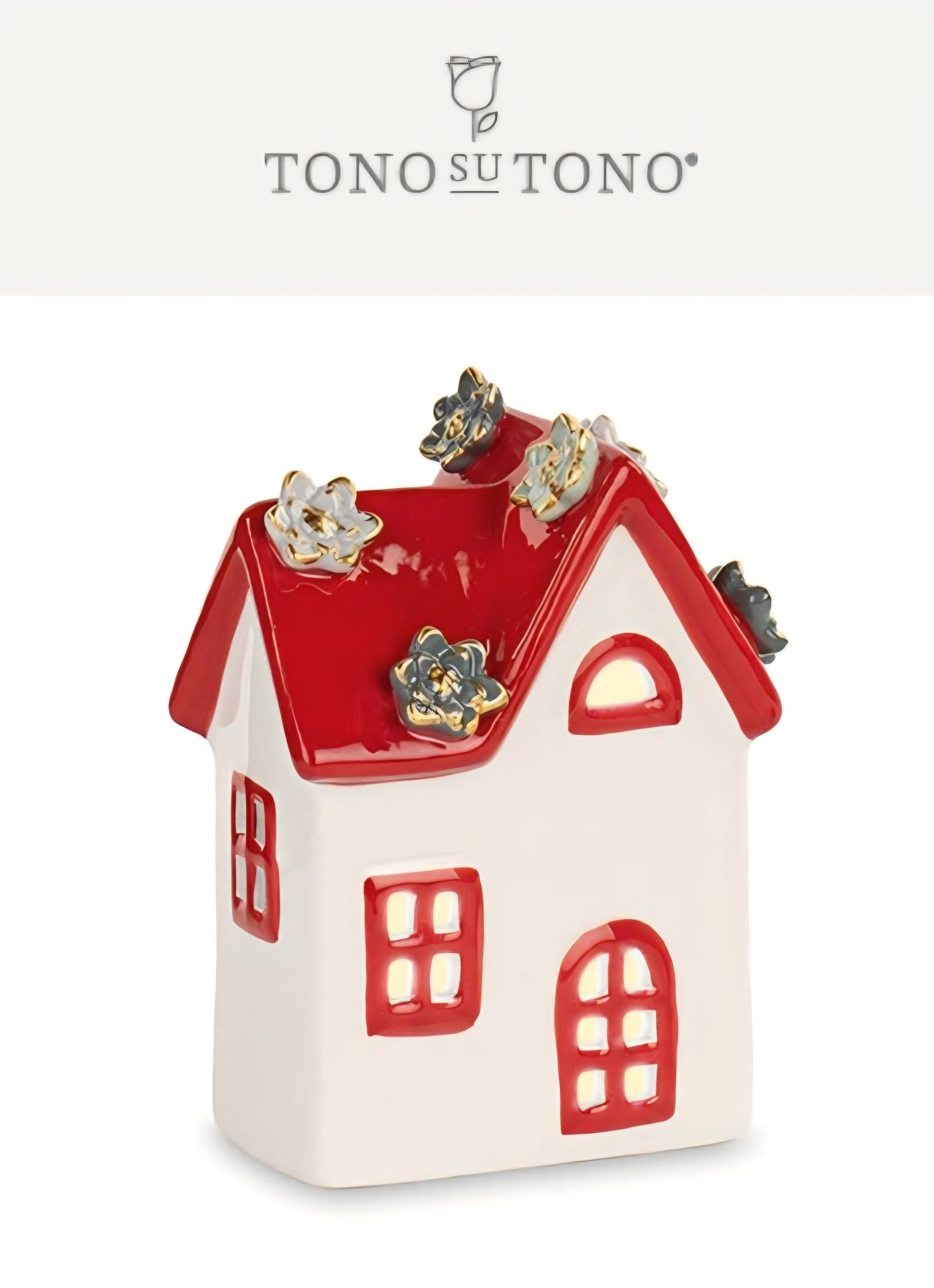 Casetta in terracotta smaltata di bianco e rosso con dei fiori in rilievo con luci a led 85x55x120