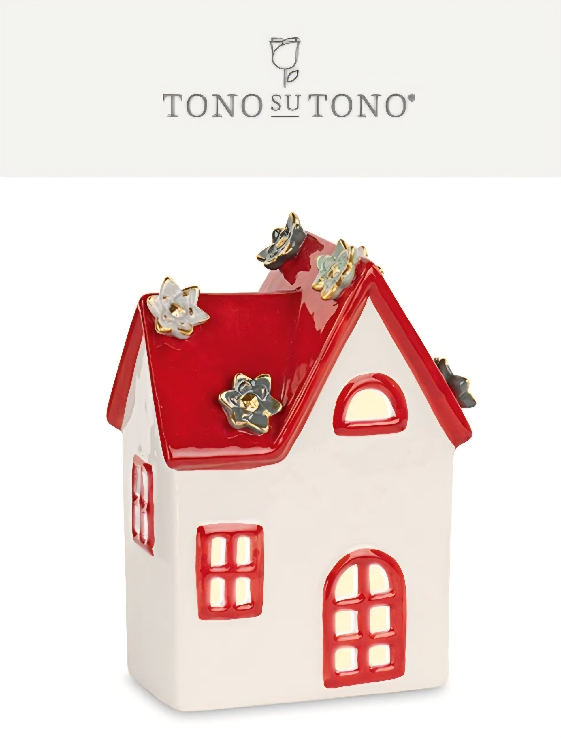 Casetta in terracotta smaltata di bianco e rosso con dei fiori in rilievo con luci a led 120x75x170
