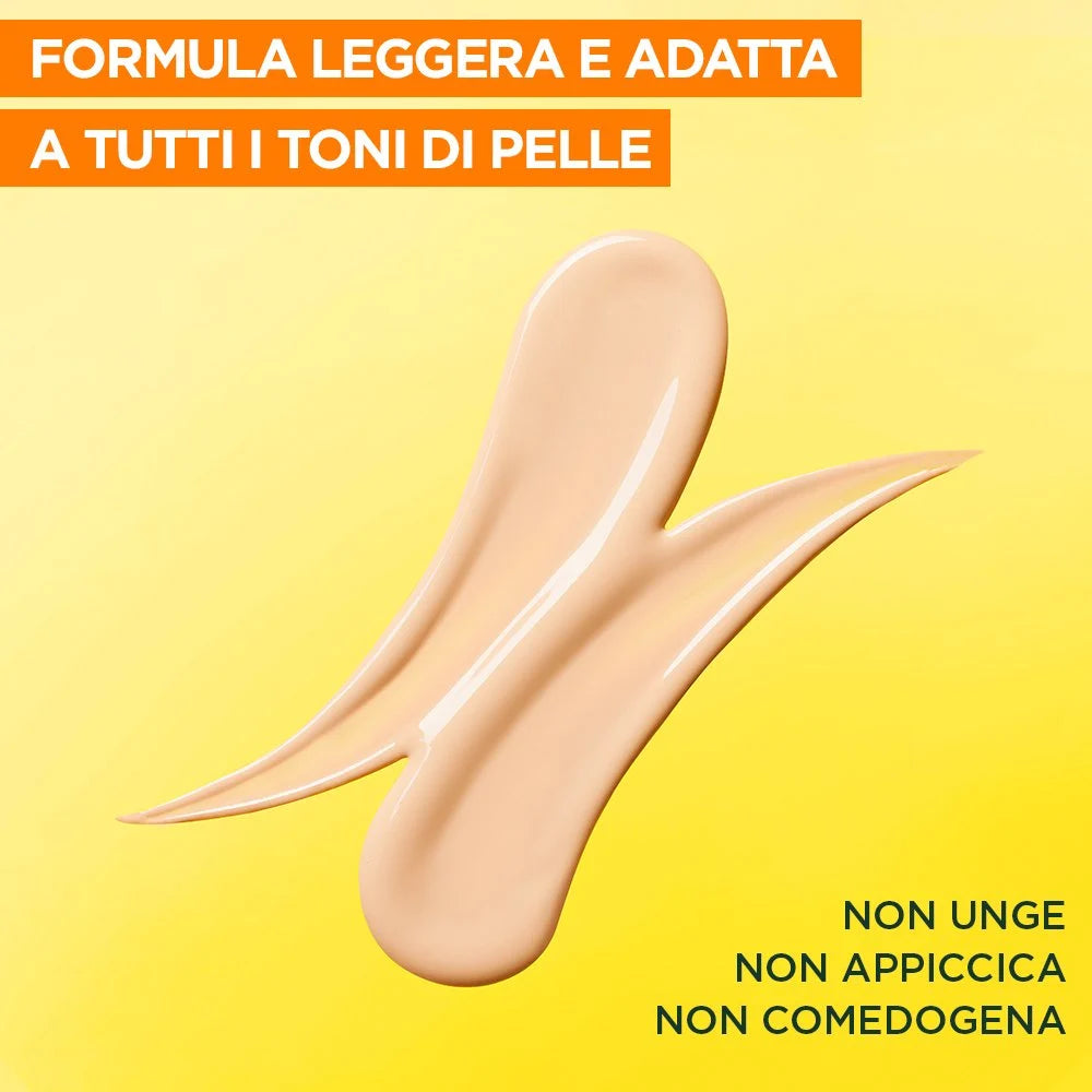 Il potere anti-macchie della VITAMINA C* incontra una PROTEZIONE MOLTO ALTA SPF50+ e PIGMENTI MINERALI in un fluido quotidiano leggero e illuminante. L'alleato per prevenire e corregere le macchie. Con Vitamina C delle proprietà illuminanti e uniformanti e una texture leggermente colorata l'incarnato risulta uniformato e con un glow istantaneo.