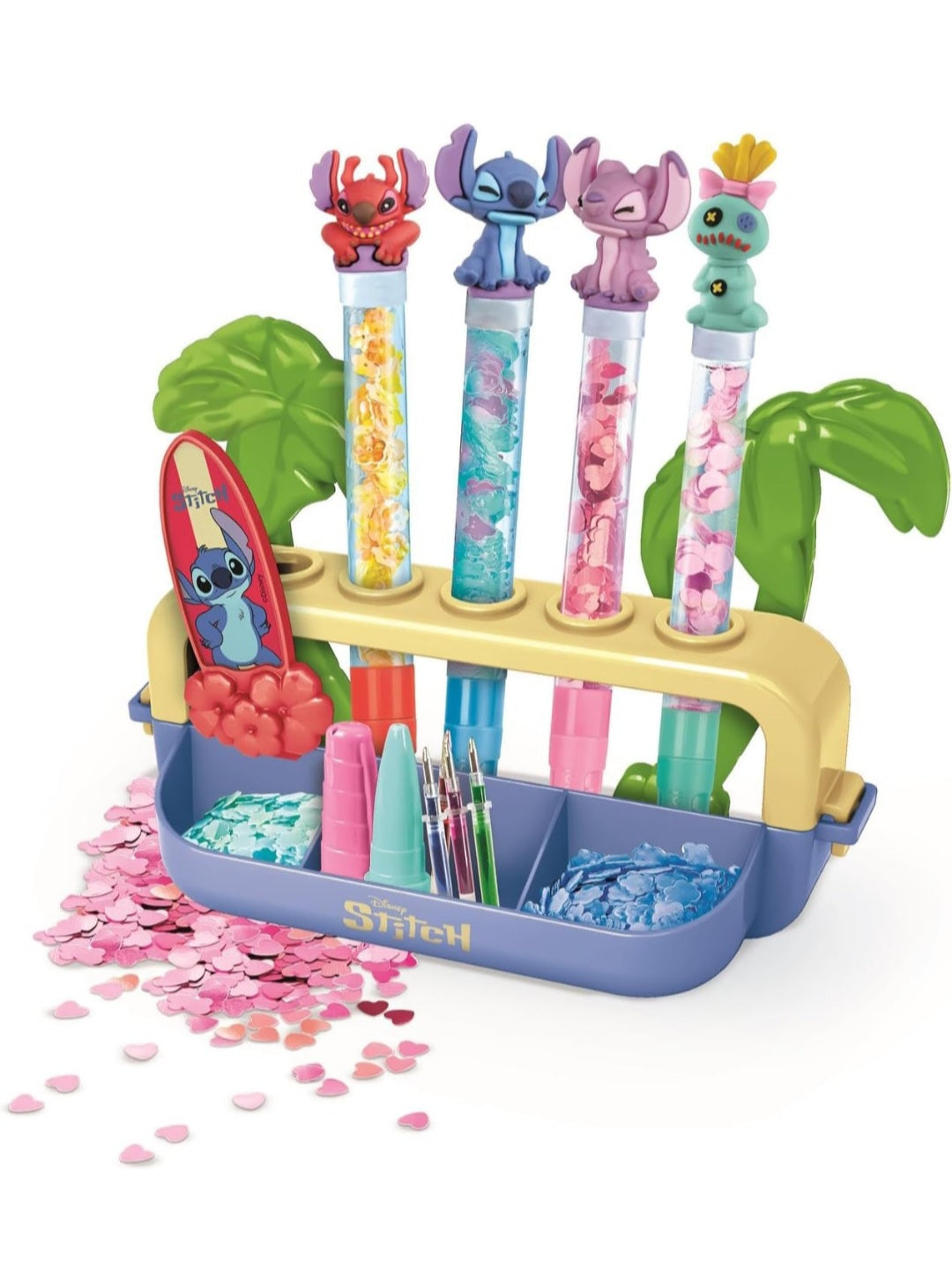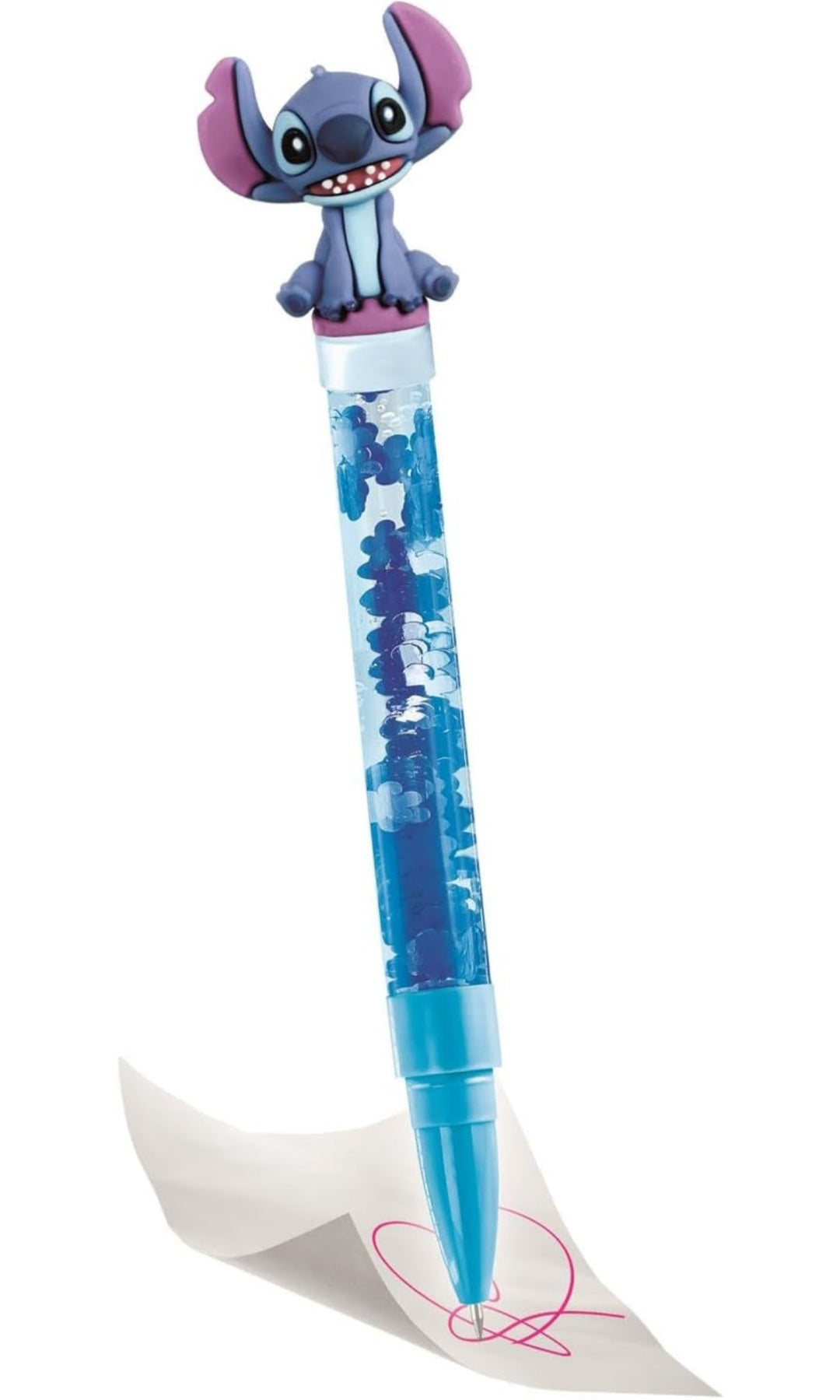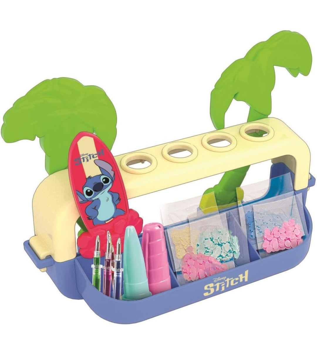 COSA CONTIENE: gioco per bambine da 6 anni in su, con base e imbuto, 5 penne personalizzabili, tappi colorati, 5 ricariche di inchiostri, 5 bustine di decorazioni scintillanti, 5 personaggi in gomma, adesivi a tema Stitch e manuale illustrato