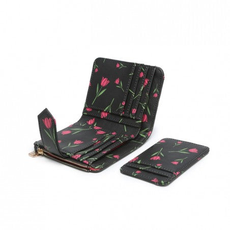 Portafoglio compatto con chiusura a bottone con portacarte estraibile. All'interno scompartimento per banconote, monete e portatessere.