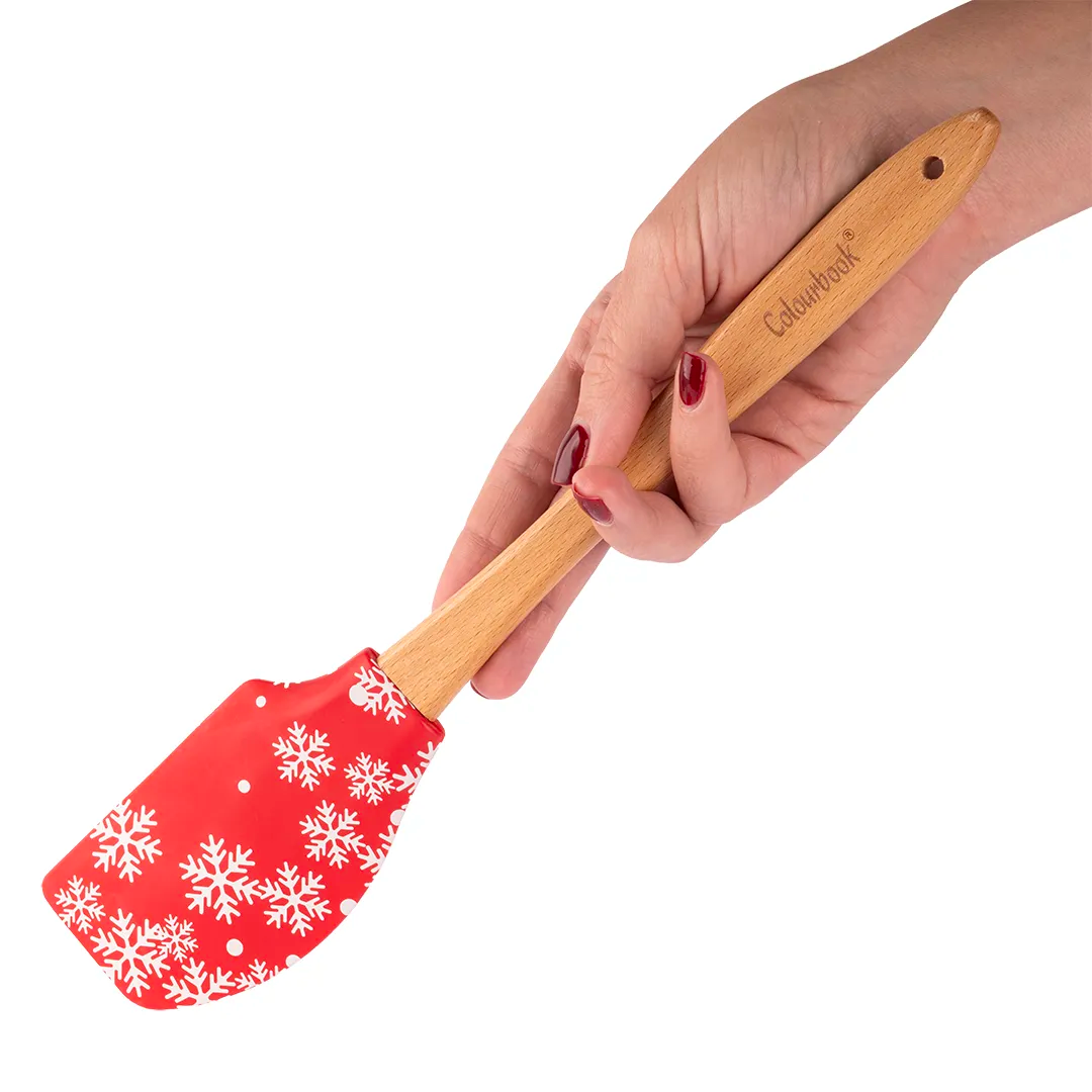 Realizzata in legno e silicone, la spatola da cucina misura 31 cm e include una formina per biscotti coordinata all’interno della confezione regalo.
