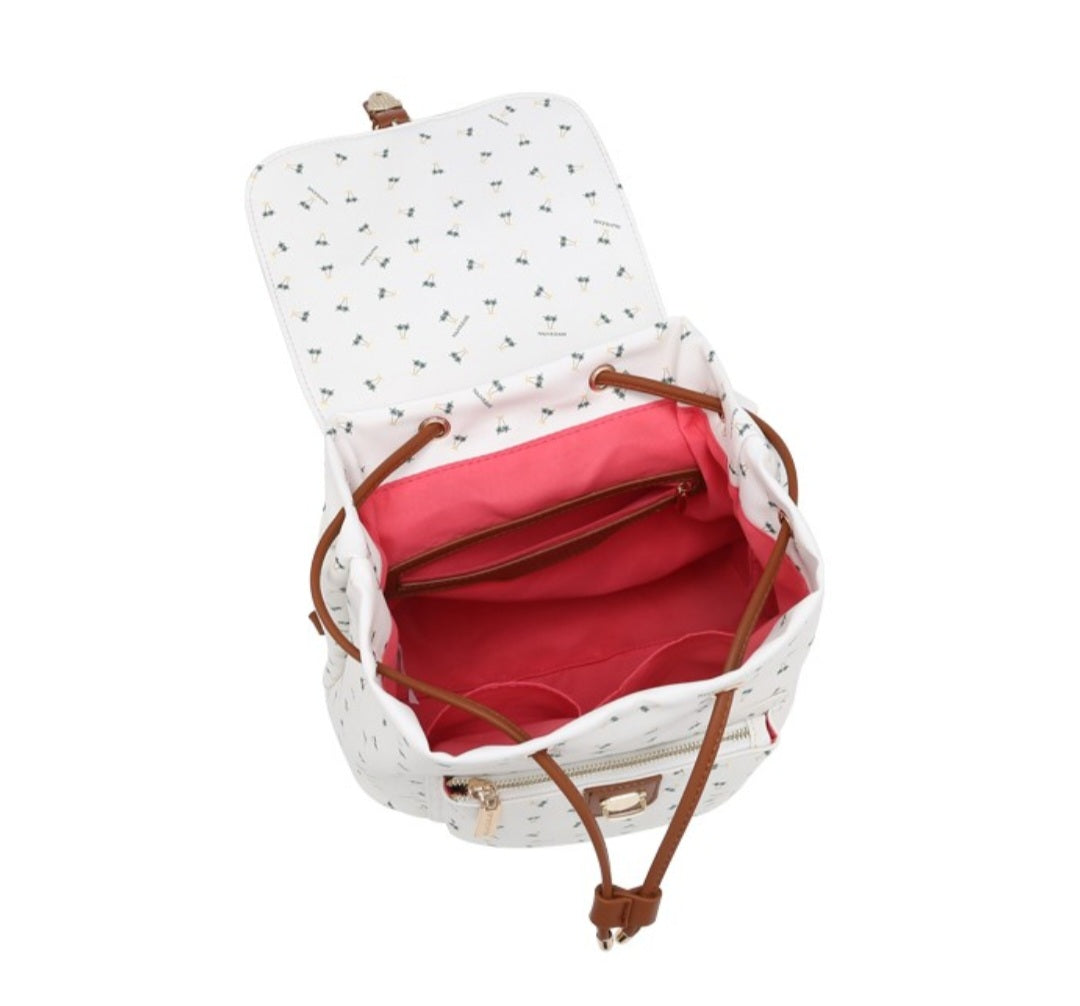 Zaino con chiusura a patta con bottone e coulisse. Tasca frontale con zip, spallacci in nastro regolabile. All'interno una tasca con zip e due taschine aperte.